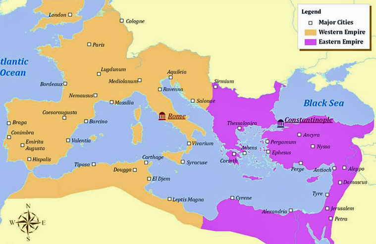 When Theodosius died, his two sons inherited what was left of Rome. They each took up power over half the empire: one in the Eastern empire, which was centered in Constantinople; and one in the Western empire, which was centered in Rome.