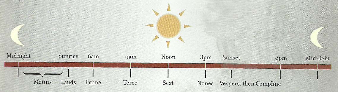 The monks prayed at daybreak then again at 6:00 am, 9:00 am, noon, 3:00 pm, sunset, 9:00 pm, and at midnight. The worship ceremonies were named as follows: Lauds was the daybreak ceremony then there was Prime, Terce, Sext, Nones, Vespers, Compline, and Matins was the midnight, vigil-like session.
