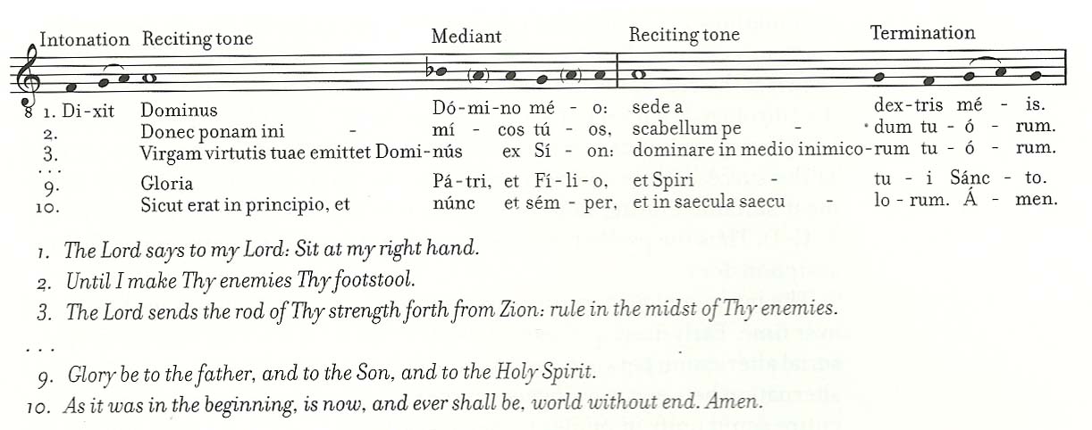 Here is a recitation formula for psalm 109, Dixit dominus as shown in A History of Western Music by Charles Burkholder, Donald J. Grout, and Claude Palisca: