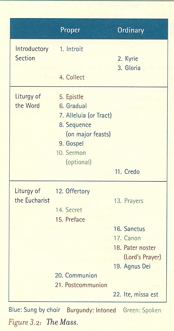 The texts that stay the same—the ordinary—are known as the Kyrie, Gloria, Credo, Sanctus, and Agnus Dei. Each of these mass parts has a coinciding Gregorian chant, originally sung by the congregation but eventually sung by the choir. The other parts of the mass, the Introit, the Offertory, the Alleluia, etc., change day-to-day but also have coinciding chants, usually some form of a psalm (Burkholder, et al. 49 – 50).