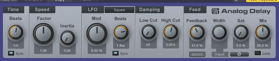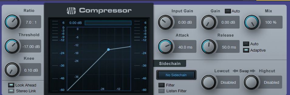 Here’s a sample compressor setting for a kick drum: Ratio (7:1); Threshold (-17 dB); Knee (.10 dB); Attack (40 ms); Release (50 ms).