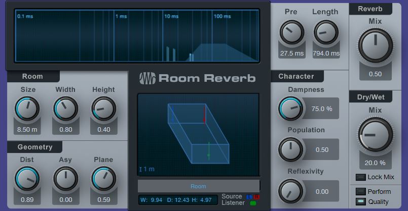 - Room size combines a few other parameters to simulate a specific room dimension. When adjusting room size, the sounds will be layered to mimic a room, hall, or acoustic chamber.