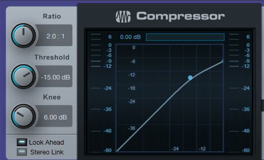 Here’s a sample compressor setting for a kick drum: Ratio (7:1); Threshold (-17 dB); Knee (.10 dB); Attack (40 ms); Release (50 ms).